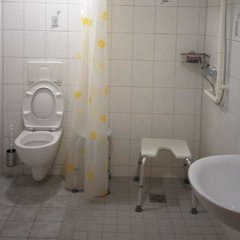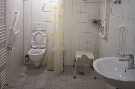 - Sanitärraum mit Dusche, WC, Waschtisch und Waschmaschinenanschluss