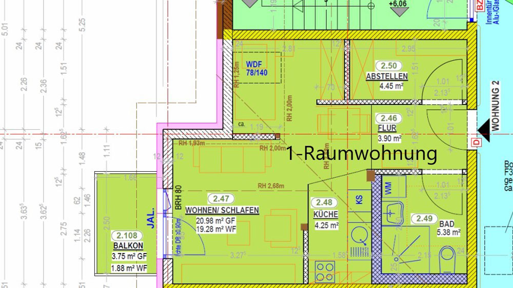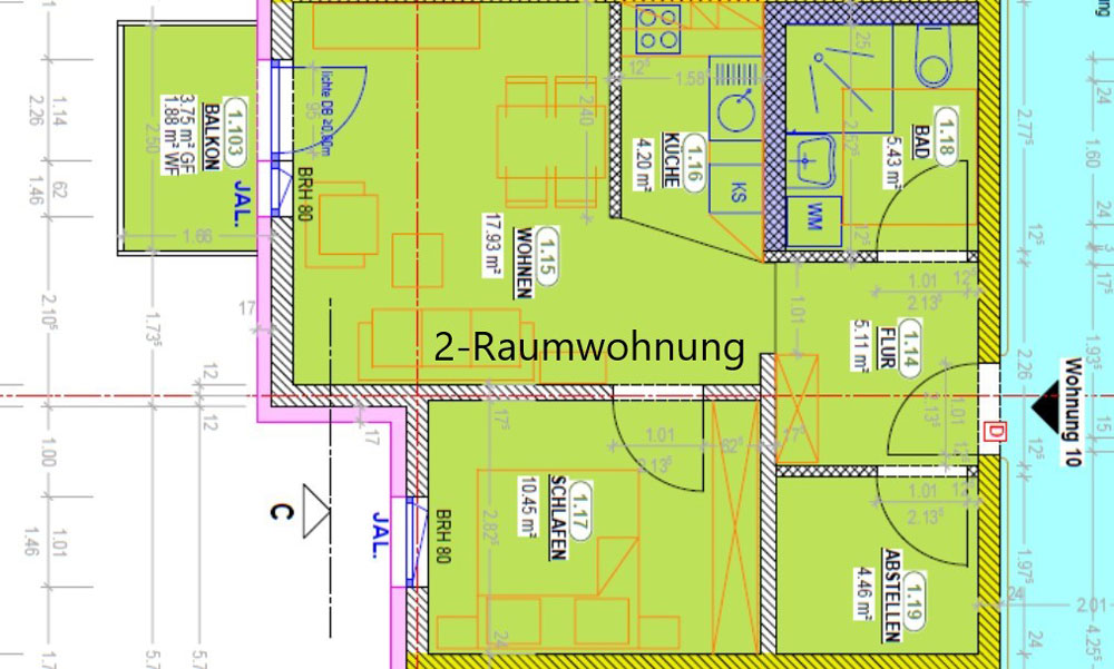Im diesem Wohnhaus befinden sich 12x 2-Raumwohnungen und 19x 1-Raumwohnungen zwischen 39- 47 qm Wohnfläche. Die Wohnungen bestehen aus einem Badezimmer mit ebenerdiger Dusche, Abstellraum, Flur, Küchennische, Wohnzimmer und einer Schlafnische mit separaten Fenster. Die Schlafnische kann durch einen Vorhang abgetrennt werden. In den 2- Raumwohnungen ist das Schlafzimmer durch eine Tür getrennt. Jede Wohnung besitzt einen Balkon oder Terrasse, die einen herrlichen Blick auf Zschorlau oder auf die Wiesen Richtung Albernau versprechen.